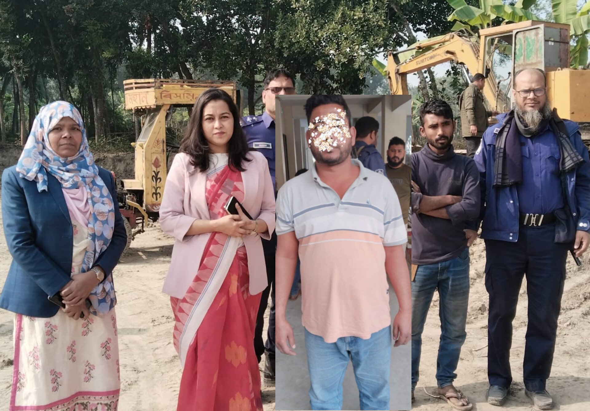 এসময় উপজেলা নির্বাহী অফিসার ও নির্বাহী ম্যাজিস্ট্রেট ফারজানা আক্তার তাকে হাতে নাতে ধরে ভ্রাম্যমাণ আদালত বসিয়ে বালুমহল ও মাটি ব্যবস্থাপনা আইন ২০২৩ এর ১৫ ধারা অপরাধে ৭ দিনের কারাদণ্ড ও ১ হাজার টাকা জরিমানা করা হয়। এসময় উপস্থিত ছিলেন উপজেলা নির্বাচন কর্মকর্তা ফাতেমা খাতুন।