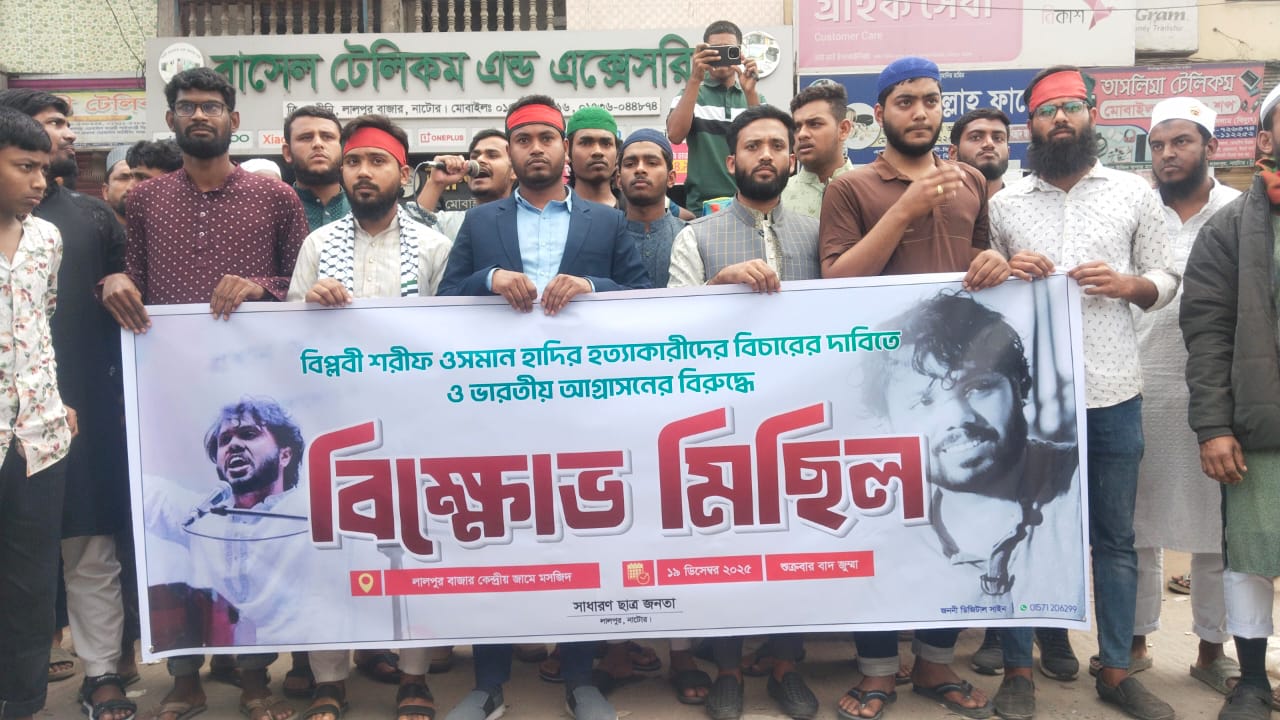 শুক্রবার (১৯ ডিসেম্বর) জুম্মার নামায শেষে সাধারণ ছাত্র জনতার ব্যানারে লালপুর বাজার কেন্দ্রীয় জামে মসজিদ থেকে এই বিক্ষোভ মিছিল বের করা হয়। বিক্ষোভ মিছিলটি লালপুর শ্রী সুন্দরী পাইলট উচ্চ বিদ্যালয় গেট থেকে বের হয়ে লালপুর বাজার প্রদক্ষিণ করে। এসময় তারা, তুমি কে, আমি কে, হাদি হাদি, দিল্লি না ঢাকা, ঢাকা ঢাকা, আমার ভাই কবরে, খুনিরা কেন বাহিরে, লীগ ধর, জেলে ভর, ইনকিলাব জিন্দাবাদ, জিন্দাবাদ বলে স্লোগান দেন।