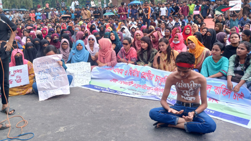 শিক্ষার্থীবৃন্দ, রাজশাহী বিশ্ববিদ্যালয়- এর ব্যানারে এ কর্মসূচি অনুষ্ঠিত হচ্ছে। বিক্ষোভ চলাকালে শিক্ষার্থীরা চারটি দাবি উত্থাপন করেন। দাবিগুলো হলো— ২০১৮ সালের পরিপত্র বহাল সাপেক্ষে কমিশন গঠন করে সরকারি চাকরিতে কোটাপদ্ধতি সংস্কার করতে হবে, তবে কোটায় প্রার্থী না পাওয়া গেলে মেধাকোটায় শূন্যপদ পূরণ করতে হবে; ব্যক্তি তার জীবদ্দশায় সব ধরনের সরকারি প্রতিযোগিতামূলক পরীক্ষায় একবার কোটা ব্যবহার করতে পারবে, এর মধ্যে পাবলিক বিশ্ববিদ্যালয় ভর্তি পরীক্ষা অন্তর্ভুক্ত থাকবে-প্রতি জনশুমারির সঙ্গে অর্থনৈতিক সমীক্ষার মাধ্যমে বিদ্যমান কোটার পুনর্মূল্যায়ন নিশ্চিত করতে হবে-দুর্নীতিমুক্ত, নিরপেক্ষ ও মেধাভিত্তিক আমলাতন্ত্র নিশ্চিত করতে কার্যকর ব্যবস্থা গ্রহণ করতে হবে। দাবি আদায় না হওয়া পর্যন্ত তারা এ আন্দোলন অব্যাহত রাখার ঘোষণা দেন।