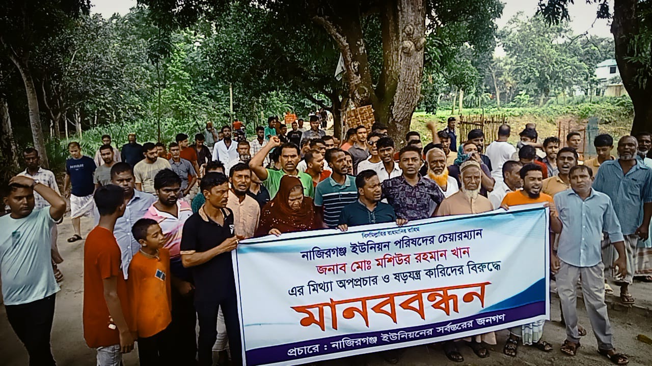 সুজানগরের নাজিরগঞ্জ ইউনিয়ন পরিষদের চেয়ারম্যান মোঃ মশিউর রহমান খান এর বিরুদ্ধে মিথ্যা অপপ্রচার ও ষড়যন্ত্রকারিদের বিরুদ্ধে মানববন্ধন করেছে গোয়ারিয়া বাজারে নাজিরগঞ্জ ইউনিয়নের সর্বস্তরের জনগণ নাজিরগঞ্জ ইউনিয়নের গোপালপুর নিবাসী মোঃ কামাল খলিফা জানান নাজিরগঞ্জ ইউনিয়ন পরিষদের চেয়ারম্যান মোঃ মশিউর রহমান খান একজন সৎ মানুষ। তিনি নিষ্ঠার সাথে এলাকার মানুষের সেবা করে যাচ্ছেন। কিন্তু এলাকার কিছু সুযোগ সন্ধানী মানুষ তার বিরুদ্ধে অপপ্রচার করে যাচ্ছেন। তিনি জানান আমাদের ইউনিয়ন পরিষদে ঈদের আগে দুস্থ মানুষের জন্য ২৩১৮ টি চাউলের কার্ড আসে এবং চেয়ারম্যান সেগুলো ইউনিয়ন পরিষদের মাধ্যমে বিতরণ করা শুরু করেন কিন্তু অতিরিক্ত গরমের কারনে অনেক তালিকা ভুক্ত লোক ঐদিন তাদের চাউল নিতে না আশায় অবশিষ্ট চাউল গোয়ারিয়া বাজারে সরকারী অনুমোদন প্রাপ্ত গুদামে থেকে যায়। এদিকে কিছু স্বার্থান্বেষী নেতৃবৃন্দ ঐ চাউলকে দলীয় চাউল দাবি করে চেয়ারম্যানের কাছে দাবি করে কিন্তু চেয়ারম্যান তা দিতে অপারগতা প্রকাশ করায় কিছু সাংবাদিকের মাধ্যমে তার বিরুদ্ধে অপপ্রচার চালায়।আমরা এই অপপ্রচার ও মিথ্যা হয়রানি মূলক অপবাদের নিন্দা জানাই।