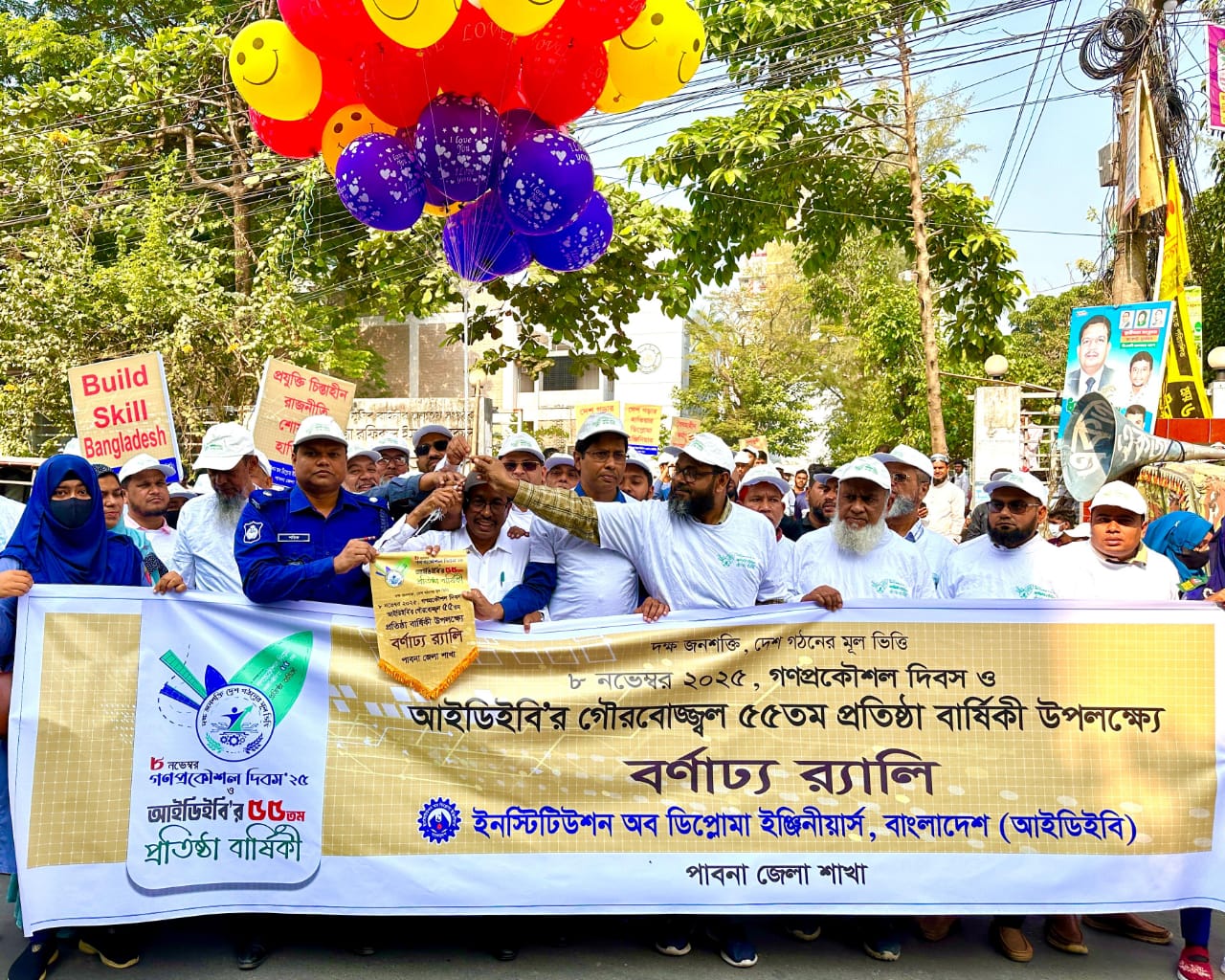 পাবনায় “দক্ষ জনশক্তি – দেশ গঠনের মূল ভিত্তি” এই স্লোগানে ইনস্টিটিউশন অব ডিপ্লোমা ইঞ্জিনীয়ার্স, বাংলাদেশ (আইডিইবি) এর ০৮ নভেম্বর গণপ্রকৌশল দিবস ও আইডিইবি’র ৫৫তম প্রতিষ্ঠা বার্ষিকী উদযাপিত হয়েছে।
