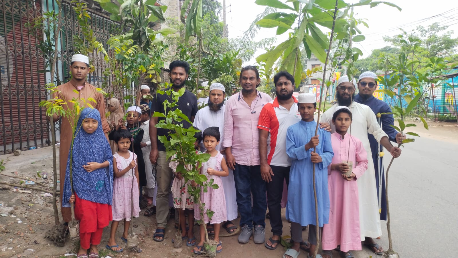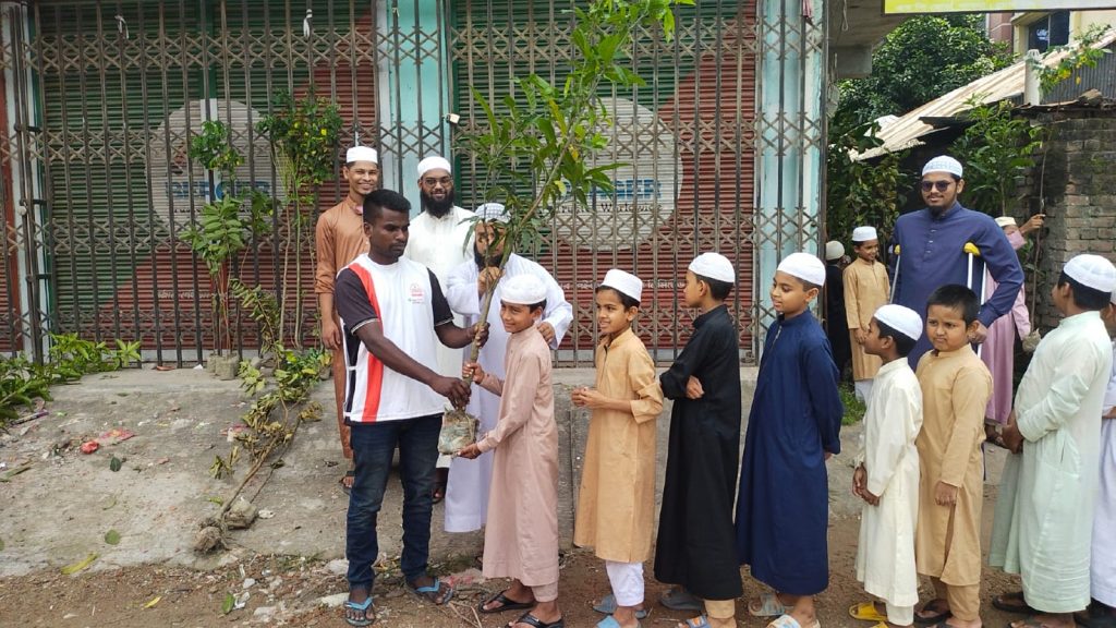 সকাল ১০টায় শহরের লাইব্রেরি বাজার আরবাব হাফিজিয়া মাদ্রাসার সামনে মাদ্রাসার ছাত্র-ছাত্রী, শিক্ষক, পথচারী ও রিকশাশ্রমিকদের মাঝে শতাধিক উন্নতমানের আম, জাম, লিচু, পেয়ারা, নিমসহ বিভিন্ন প্রজাতির ফলজ ও ঔষধি গাছ বিতরণ করা হয়।
