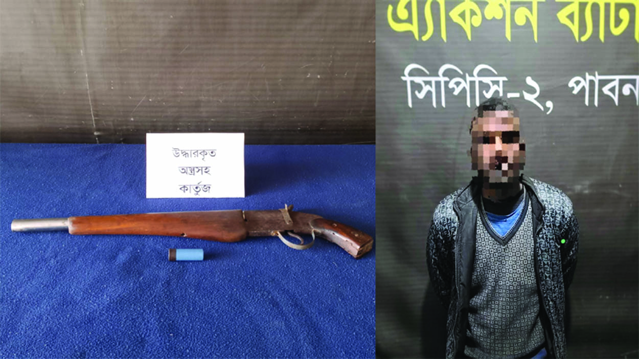 পাবনার সদর উপজেলায় র্যাপিড অ্যাকশন ব্যাটালিয়ন (র্যাব)-১২ এর অভিযানে একটি অবৈধ আগ্নেয়াস্ত্র ও এক রাউন্ড কার্তুজসহ একজনকে গ্রেফতার করা হয়েছে।