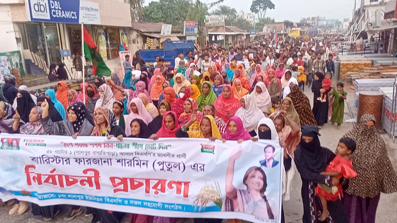 নাটোর-১ আসনে বিএনপির মনোনীত ধানের শীষের প্রার্থী ব্যারিস্টার ফারজানা শারমিন পুতুলের পক্ষে নির্বাচনী প্রচারনা ও গণ মিছিল করেছে তার কর্মী ও সমর্থকর রবিবার (১৬নভেম্বর) বিকেলে উপজেলার ১০টি ইউনিয়ন ও ১টি পৌরসভায় এই গণ মিছিল করা হয়।
