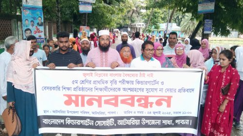 কিন্ডারগার্টেন শিক্ষার্থীদের প্রাথমিক বৃত্তি থেকে বঞ্চিত করার প্রতিবাদে আটঘরিয়ায় মানববন্ধন ও স্মারক লিপি প্রদান
