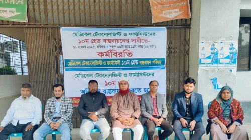 আটঘরিয়ায় মেডিকেল টেকনোলজিস্ট ও ফার্মাসিস্টদের ১০ম গ্রেড বাস্তবায়নের লক্ষ্যে ২ ঘন্টা কর্মবিরতি পালন