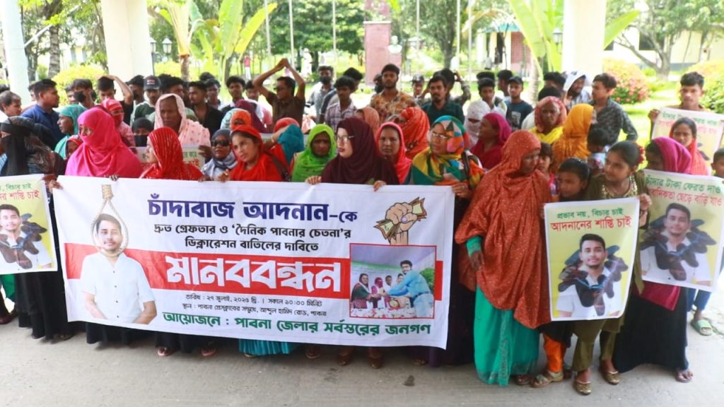 পাবনায় চাঁদাবাজি, ভয়ভীতি প্রদর্শন ও অপসাংবাদিকতার অভিযোগে এস এম আদনান উদ্দিন এবং তার নিয়ন্ত্রিত স্থানীয় পত্রিকা “দৈনিক পাবনার চেতনা”-এর বিরুদ্ধে আইনগত ব্যবস্থা গ্রহণের দাবিতে মানববন্ধন কর্মসূচি পালিত হয়েছে।
