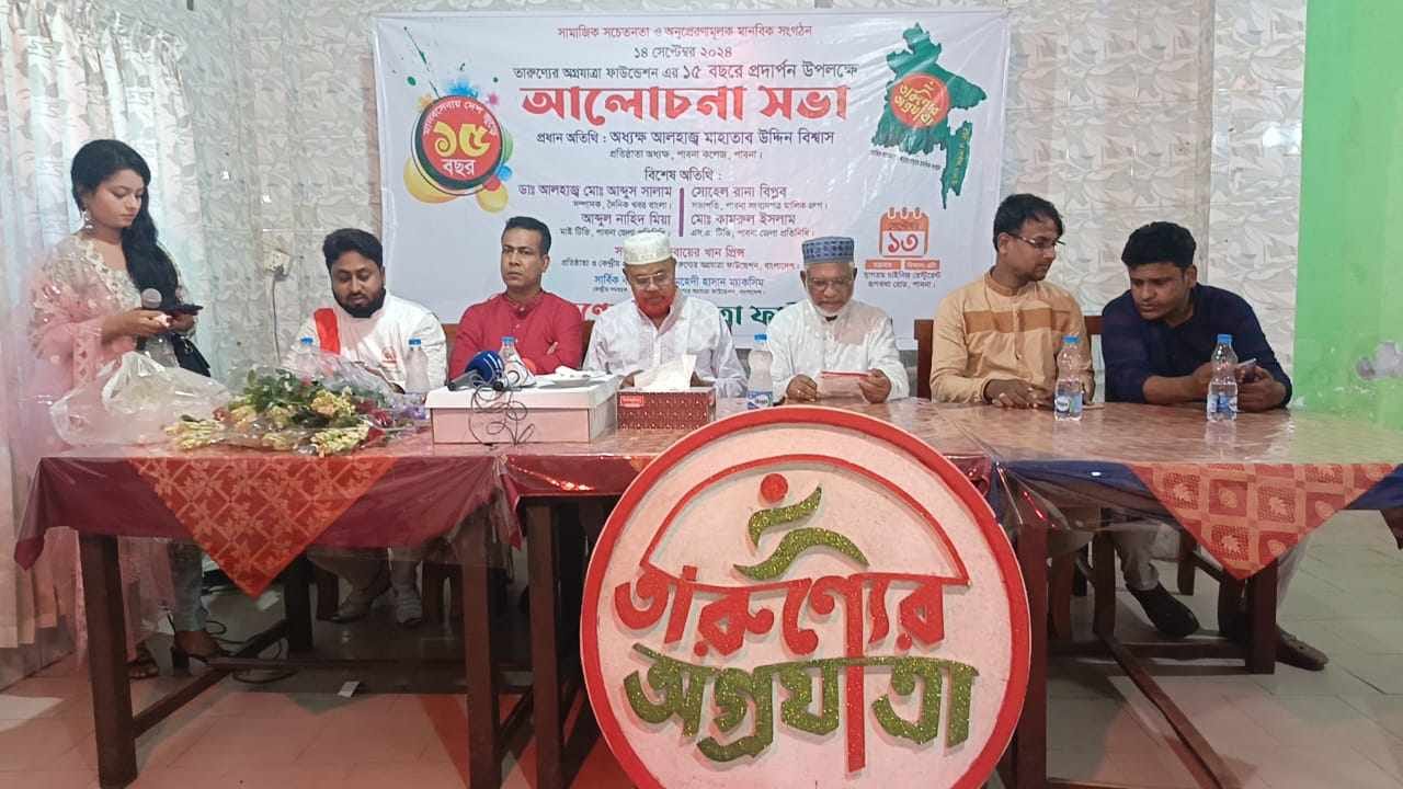 সামাজিক সচেতনতা ও অনুপ্রেরণামূলক মানবিক সংগঠন তারুণ্যের অগ্রযাত্রা ফাউন্ডেশন ১৪ সেপ্টেম্বর ২০২৪ শনিবার ১৫ বছরে পদার্পণ উপলক্ষে পাবনা স্বাগতম চাইনিজ রেস্টুরেন্ট কনভেনশন হলে আলোচনা ও দোয়া অনুষ্ঠান উদযাপন করা হয়।
